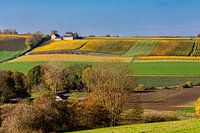 De Jekervallei met zicht op apostelhoeve in Maastricht omringd met warme herfst kleuren, In deze foto komt mooi het heuvelachtige karakter van zuid-Limburg naar voren met het gevoel ergens in het verre buitenland te zitten door de wijnranken.