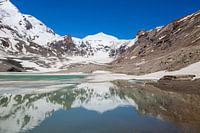 Het Nationaal Park Hohe Tauern met de Johannisberg wordt weerspiegeld in de Sandersee. Kleine resten sneeuw van de Pasterze drijven in het meer. De Gamsgrubenweg verschijnt rechts.