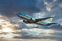 De KLM PH BGT, Boeing 737-700, genaamd Blauwe Kiekendief, stijgt op vanaf Amsterdam International Airport Schiphol. Schiphol is de thuisbasis van de KLM.