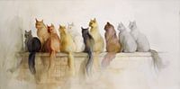 Een verfijnde aquarelachtige compositie van acht elegante katten die zij aan zij op een muur zitten. De katten zijn in verschillende zachte tinten geschilderd, van diepzwart tot roomwit, met prachtige lange staarten die sierlijk naar beneden hangen. De subtiele kleurovergangen en de dromerige sfeer geven het werk een tijdloze, rustgevende uitstraling.