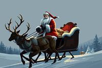 De Kerstman rijdt met zijn betoverde slee door bevroren landschappen, geleid door standvastige rendieren, en draagt hoop, vreugde en de belofte van een magische kerstochtend met zich mee.