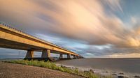 De brug die de Noordoostpolder verbind met de rest van Flevoland. Vastgelegd met een sluitertijd van 2 minuten voor strak water en bewegende wolken. De zon die in het water zakte verlichtte de brug mooi.
