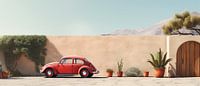 Op dit serene kunstwerk staat een roodkleurige Volkswagen Kever, een icoon van retro-automobielontwerp, geparkeerd voor een stucco muur die badend in het zonlicht een woestijngevoel oproept.