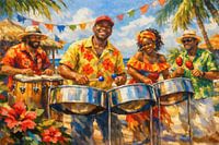 Het schilderij toont vier vrolijke personen die samen muziek maken op een zonnig strand, lachend en gekleed in kleurrijke zomerse kleding. Twee mannen dragen strohoeden en de vrouw draagt een rood/gele haarband. De groep speelt Caribische muziek. De man en de vrouw bespelen stalen steeldrums met stokken, de andere man bespeeld de…