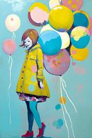 Kleurrijk aquarel portret van een meisje met ballonnen in voornamelijk geel en blauw tinten.