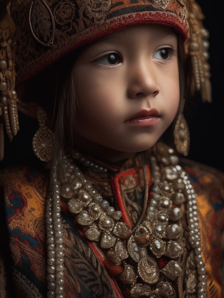 Een betoverend portret van een jong kind gehuld in rijk versierde, traditionele kleding. De warme tinten van rood, goud en bruin vormen een harmonieus geheel met de lagen van parels, gouden hangers en sierlijke kettingen. Het hoofddeksel, afgewerkt met rood bont en delicate ornamenten, geeft het beeld een koninklijke uitstraling.