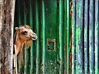 Deze kameel heeft een schuilplaats in een oud gebouw van hout en een zeecontainer. Door zijn sjofele voorkomen en de roestige achtergrond doet het dier mij denken aan een oude kluizenaar die vanuit zijn schamele onderkomen een keurende blik werpt op de wereld buiten.