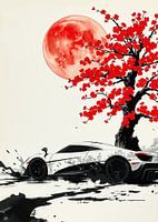 De Koenigsegg Jesko, afgebeeld in dynamische sumi-e stijl, snijdt door een wereld van vloeiende zwarte inkt. Rode kersenbloesems dwarrelen in zijn kielzog onder een gloeiende karmozijnrode maan. Een opvallende samensmelting van Zweedse hypercar power en traditionele Japanse kunstzinnigheid.