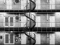 Het monumentale interieur van De Koepel gevangenis Haarlem in zwart wit.