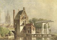 Gezicht op de Koepoort te Delft, over de brug gaan enkele figuren, links zit een jongen op een muurtje te vissen. Op de achtergrond gevels van huizen en de toren van de Oude Kerk.