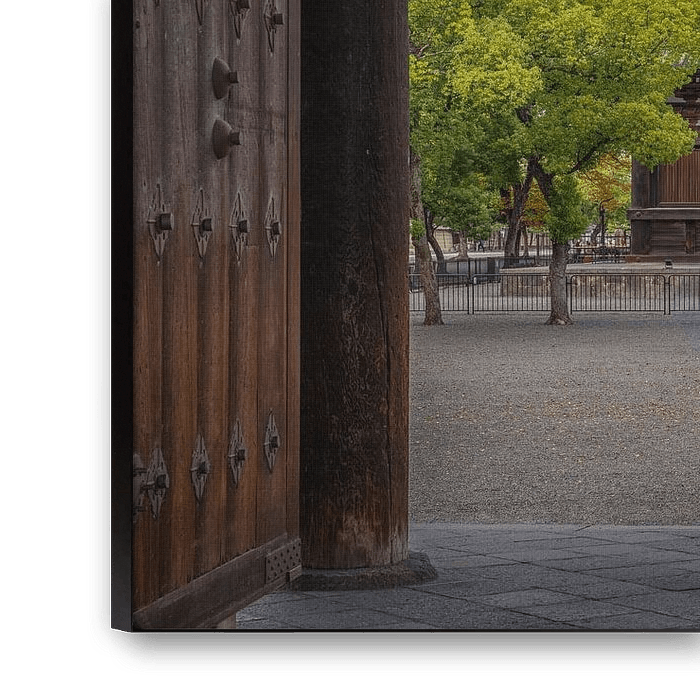 Het werk is genomen door de openstaande deuren van een omringende poort, wat een natuurlijk en krachtig houten kader creëert. Dit kader leidt de blik direct naar de massieve houten architectuur van de Kondo. Met zijn brede dak en traditionele donkere gevels straalt het gebouw de grootsheid van de vroege Heian-periode uit.