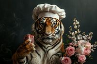 Dit indrukwekkende kunstwerk toont een tijger met een koksmuts, die op majestueuze wijze een stuk rauw vlees vasthoudt, terwijl hij omringd is door delicate roze rozen. Het contrast tussen de brute kracht van het vleesetende dier en de tedere bloemen creëert een fascinerende dynamiek. De intense blik van de tijger, gecombineerd met de symboliek van de rozen, geeft het werk een gevoel van zowel wildheid als elegantie. Dit opvallende portret is een ware blikvanger voor liefhebbers van unieke en krachtige kunstwerken.