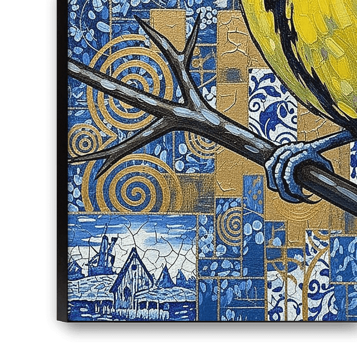 Dit kunstwerk vangt de robuuste charme van de Koolmees (Parus major) tegen een achtergrond die een ode is aan zowel de Nederlandse schildertraditie als de decoratieve weelde van de Art Nouveau.