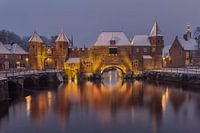 De Koppelpoort van Amersfoort met sneeuw tijdens de avond.