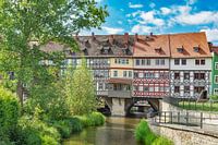 Uitzicht over de rivier de Gera naar de huizen van de Krämerbrücke. De brug ligt in de oude stadskern van Erfurt, hoofdstad van de Duitse deelstaat Thüringen, Duitsland, Europa.