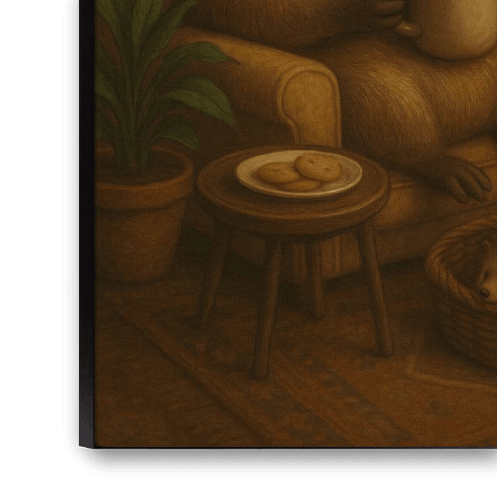 In een stille hoek van de kamer neemt rust haar plaats in. Een tevreden capibara leunt achterover met een warme mok in zijn poot, terwijl een klein egeltje vredig slaapt in zijn mandje. Alles ademt kalmte, van het zachte licht tot de geur van verse koffie.
