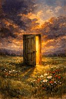 Een mysterieus surrealistisch olieverfschilderij van een verweerde houten deur die alleen staat midden in een uitgestrekte weide vol wilde bloemen. De deur staat op een kier en onthult intens warm gouden licht dat naar buiten stroomt. Lange schaduwen strekken zich uit over het gras terwijl dramatische wolken in diep paars en oranje de…