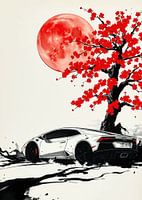 De Lamborghini Huracán, afgebeeld in dynamische sumi-e stijl, scheurt door een wereld van vloeiende zwarte inkt. Rode kersenbloesems dwarrelen in zijn kielzog onder een gloeiende karmozijnrode maan. Een krachtige fusie van Italiaanse supercar flair en traditionele Japanse kunst.