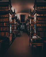 Deze symmetrische opname toont de centrale gang van Marsh’s Library in Dublin. Hoge boekenkasten reiken tot aan het gewelfde plafond, gevuld met duizenden historische boeken. Het perspectief leidt het oog richting het schilderij aan het einde van de gang, wat zorgt voor een monumentale en bijna museale uitstraling.