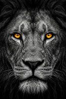 Een krachtig frontaal portret van een leeuwenkop. Het monochrome beeld benadrukt de verfijnde vachttextuur. Twee feloranje ogen trekken de aandacht en stralen intensiteit uit. De donkere achtergrond creëert een gevoel van diepte en focus. Dit is een tijdloze afbeelding van majesteit en kracht.