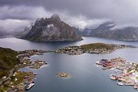 De eilandjes van de Lofoten met de gekleurde huisjes op palen staand in het zeewater. De eilandjes worden verbonden met tal van bruggen.