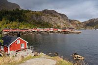 De eilandjes van de Lofoten met de gekleurde huisjes op palen staand in het zeewater. De eilandjes worden verbonden met tal van bruggen.