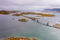 De eilandjes van de Lofoten met de gekleurde huisjes op palen staand in het zeewater. De eilandjes worden verbonden met tal van bruggen.