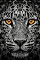 Een indrukwekkend, symmetrisch vooraanzicht van een luipaard. De zwart-wit uitvoering accentueert het unieke vlekkenpatroon en de scherpe details van de snorharen. De intens oranje ogen vormen een scherp contrast met de monochrome vacht en trekken onmiddellijk de aandacht. Deze compositie straalt zowel rust als een dreigende kracht uit.…