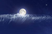 Een foto van de volle Maan die op een wolk lijkt te liggen. In de donkerblauwe lucht staat verder nog een ster. Door het maanlicht wordt een deel van de wolken opgelicht.