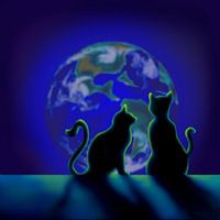 Op dit schilderij zitten twee katten op de Maan om van daaruit naar Aarde te kijken. Een mooi werk met blauw en groentinten.