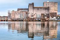 De Maassilo, een imposant industrieel bouwwerk met grote vlakken ruwe beton, gespiegeld in het bijna rimpelloze water van de Maashaven tijdens het gouden uur op een mooie zomeravond.
