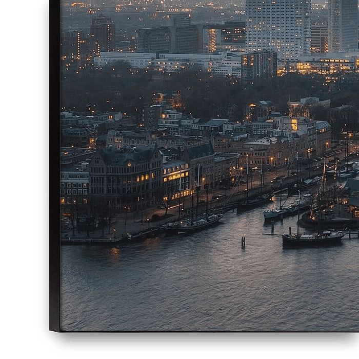 Ervaar de rustgevende grandeur van Rotterdam op deze sfeervolle avondopname. Vanuit een adembenemend hoog perspectief kijkt de kijker uit over de Maas, waar de stad zich voorbereidt op de nacht. Terwijl de lucht aan de horizon langzaam overgaat van warm goud naar een koel, diepblauw, begint de skyline van Rotterdam te fonkelen als een…