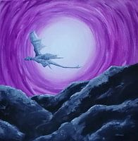 Dit acrylschilderij toont een machtige draak in vlucht boven het kale berglandschap. Het lijkt net te zijn overgekomen van de magische poort, die is afgebeeld in prachtige paarse tinten.