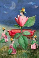 Een surrealistische collage met een magnolia in de vorm van een vrouw voor een canapé. Om haar heen groeien beelden van haarzelf uit de grond.