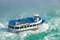 De "Maid Of The Mist" geladen met toeristen die de Horseshoe Falls binnen komt varen in een deel van de Niagara Falls, Ontario, Canada