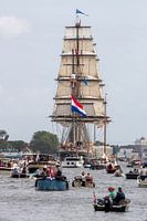 Centraal in beeld staat een majestueus tallship met volle zeilen en een grote Nederlandse vlag wapperend in de wind. Het schip komt statig recht op de toeschouwer afvaren en straalt kracht, traditie en avontuur uit. Voor het tallship vaart een stoet van kleinere boten, gevuld met mensen die meegenieten van dit unieke maritieme evenement. De sfeer is levendig en feestelijk, met overal Nederlandse vlaggen zichtbaar.