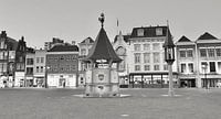 Koop de foto De Markt met puthuis van Den Bosch bij avond in zwart wit van Jasper van de Gein Photography op canvas, aluminium dibond, (ingelijste) fotoprint, behang en ArtFrame, op maat geprint in Fine-Art kwaliteit.