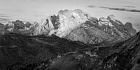 Een Zwart-Wit foto in 2:1 formaat van het eerste licht van de dag in de Dolomieten, gezien vanaf de Giaupas (Passo Giau) op 2200 meter hoogte met uitzicht op de Marmolada, een met gletsjers bedekte berg in het noordoosten van Italië op de grens tussen Trentino-Zuid-Tirol en Veneto (provincie Belluno).