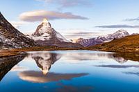 De Matterhorn wordt al vroeg in de ochtend weerspiegeld in de Riffelsee, Kanton Wallis, Zwitserland.