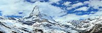 De Matterhorn met een indrukwekkende wolkenpluim. Het hooggebergte bij Zermatt. De Matterhorn vanaf zijn imposante kant onder een blauwe hemel.