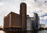 Deze foto toont het indrukwekkende silhouet van de iconische Meelfabriek in Leiden, een symbool van industrieel erfgoed en een toonbeeld van transformatie. De robuuste bakstenen structuur, hoge ramen en karakteristieke torens brengen de rijke historie van het gebouw tot leven. De subtiele reflectie in het water en de wolkenlucht versterken de dramatische en tegelijk serene sfeer.