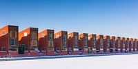 Een 2:1 foto van een koude zonnige winterdag met een blauw lucht en een bevroren "De MerodeGraft" in de voorgrond. De rij huizen van de "James Baldwinstraat" aan de "Han Diekmannkade" in de wijk "De Held" in de stad Groningen vormen een mooi decor op deze mooie winterdag.