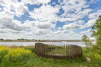 De Mijmerbank in De Onlanden provincie Drenthe. In het landschap bloeit de koolzaad welig en er boven een imposante wolkenlucht.