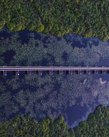Vanuit de lucht ontvouwt zich een bijna grafisch landschap rondom de iconische Moerputtenbrug. De lange spoorbrug snijdt als een strakke lijn door het donkere water, omringd door drijvende waterplanten en dichtbegroeide oevers. Het contrast tussen het geometrische lijnenspel van de brug en de organische vormen van de natuur zorgt voor…