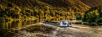 Het laatste avondlicht in het Moezeldal waar het spiegelende water doorklieft wordt door een vrachtboot