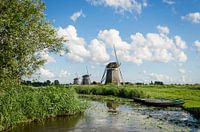 Een landschap in de polder tussen Stompwijk en Leidschendam met de drie molens van de Molendriegang onder fraaie Hollandse wolkjes langs de vaart waarin enkele roeibootjes liggen te wachten.