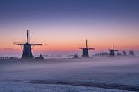 De Molendriegang in Leidschenveen, tijdens een koude zonsopkomst. Gehuld in prachtige paarse pasteltinten zien zij de komende dag tegemoet.