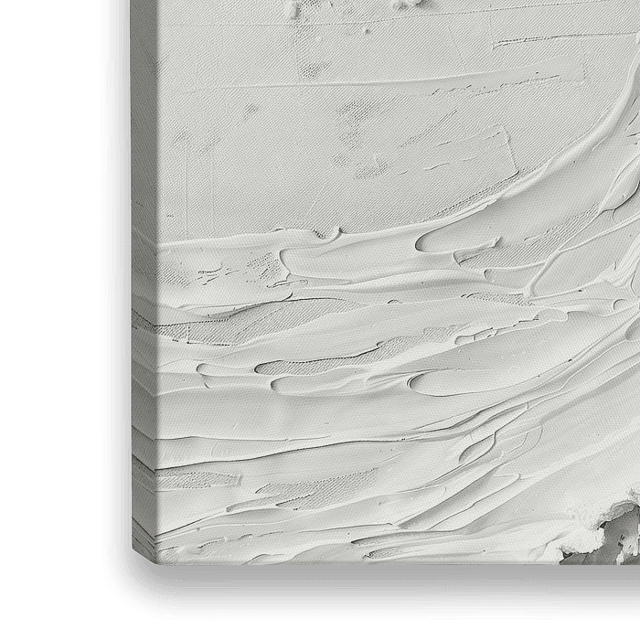 Indrukwekkende golf uit die op het punt staat te breken, volledig uitgevoerd in een monochrome witte stijl. De kunstenaar gebruikt dikke lagen verf om de vorm en energie van een opkomende golf te vangen, waarbij de curve van de golf krachtig naar voren komt en de spetters en schuimvlokken bijna tastbaar lijken. De textuur van het…