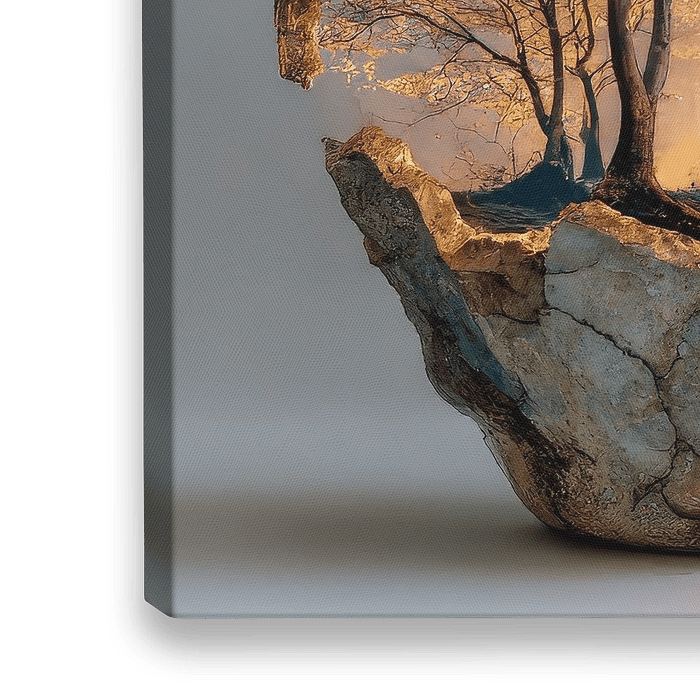 Dit schilderij vertelt een verhaal van breekbaarheid en kracht. Achter het verweerde, gebarsten oppervlak van een stenen kruik schuilt een verborgen wereld: een majestueuze boom die badend in warm zonlicht zijn wortels stevig verankert, symbool voor leven, groei en veerkracht.