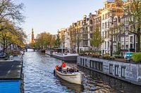 De prinsengracht op een koude herfstdag vastgelegd met idyllische een boot op de voorgrond en in de verte de westertoren, dit alles met de mooie herfstkleuren.